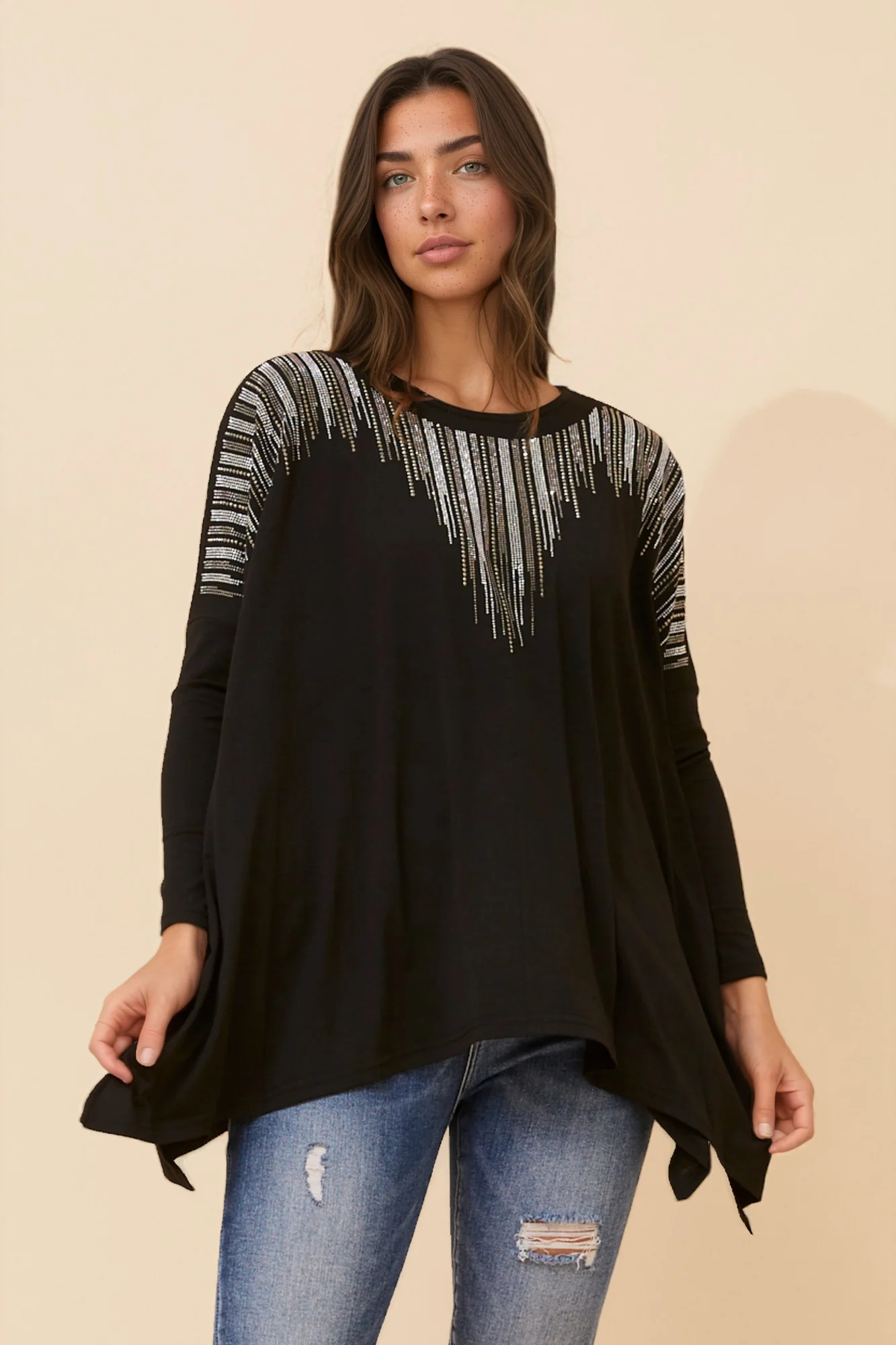 This versatile top features a solid color for a timeless look, while the sequin detailing adds a hint of sparkle and sophistication! Pair this top with jeans for a laid-back day look.