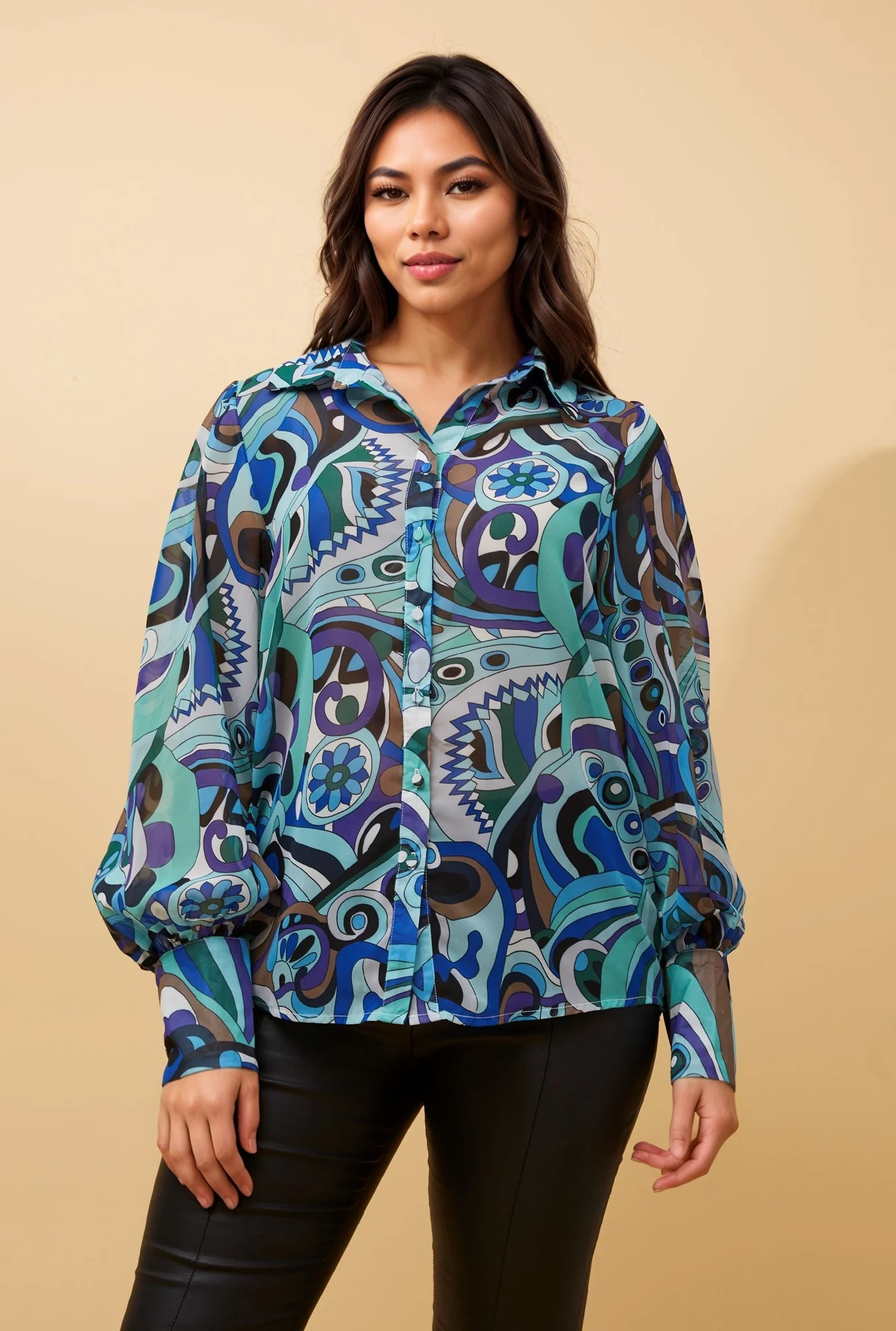 - Long balloon sleeves with button detail on cuffs