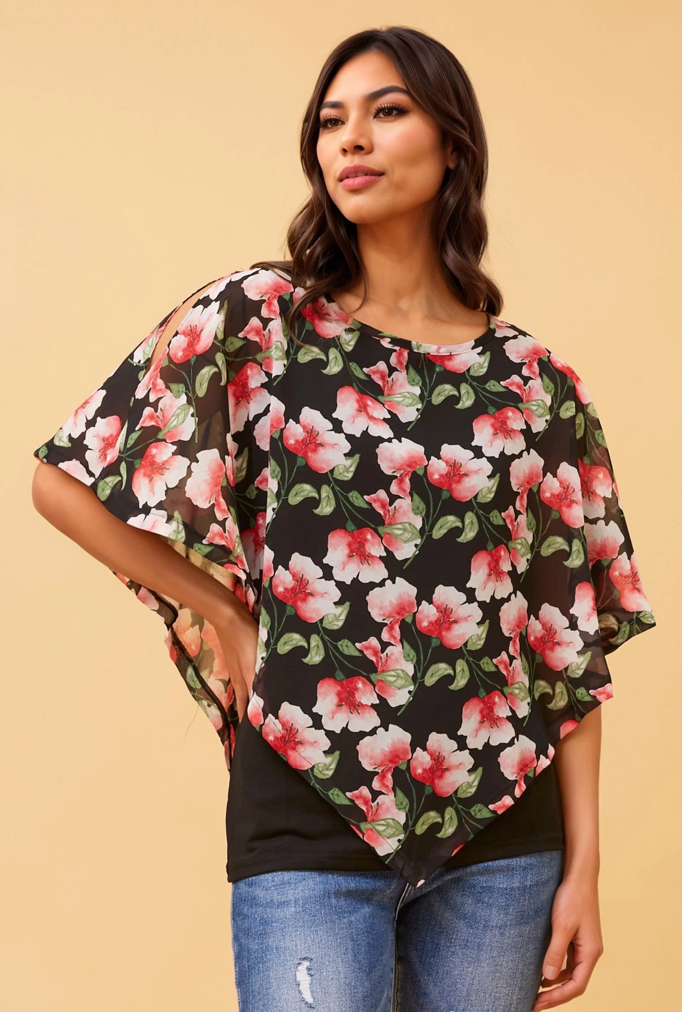 Achieve an elegant look with this butterfly sleeve top. Sheer black fabric with beautiful floral print featuring asymmetric hem and slit sleeves give you chic elegant look! Pair it with your favourite slim pants and strappy heels to finish the look!