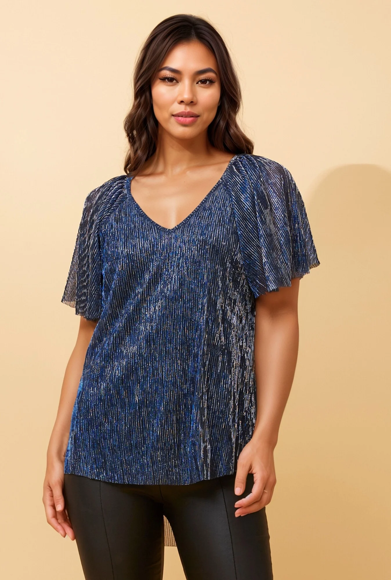 Add a stylish top to your transeasonal styling collection with this sparkly pleated blouse! Simply wear with skinnies and heels for your next big event!