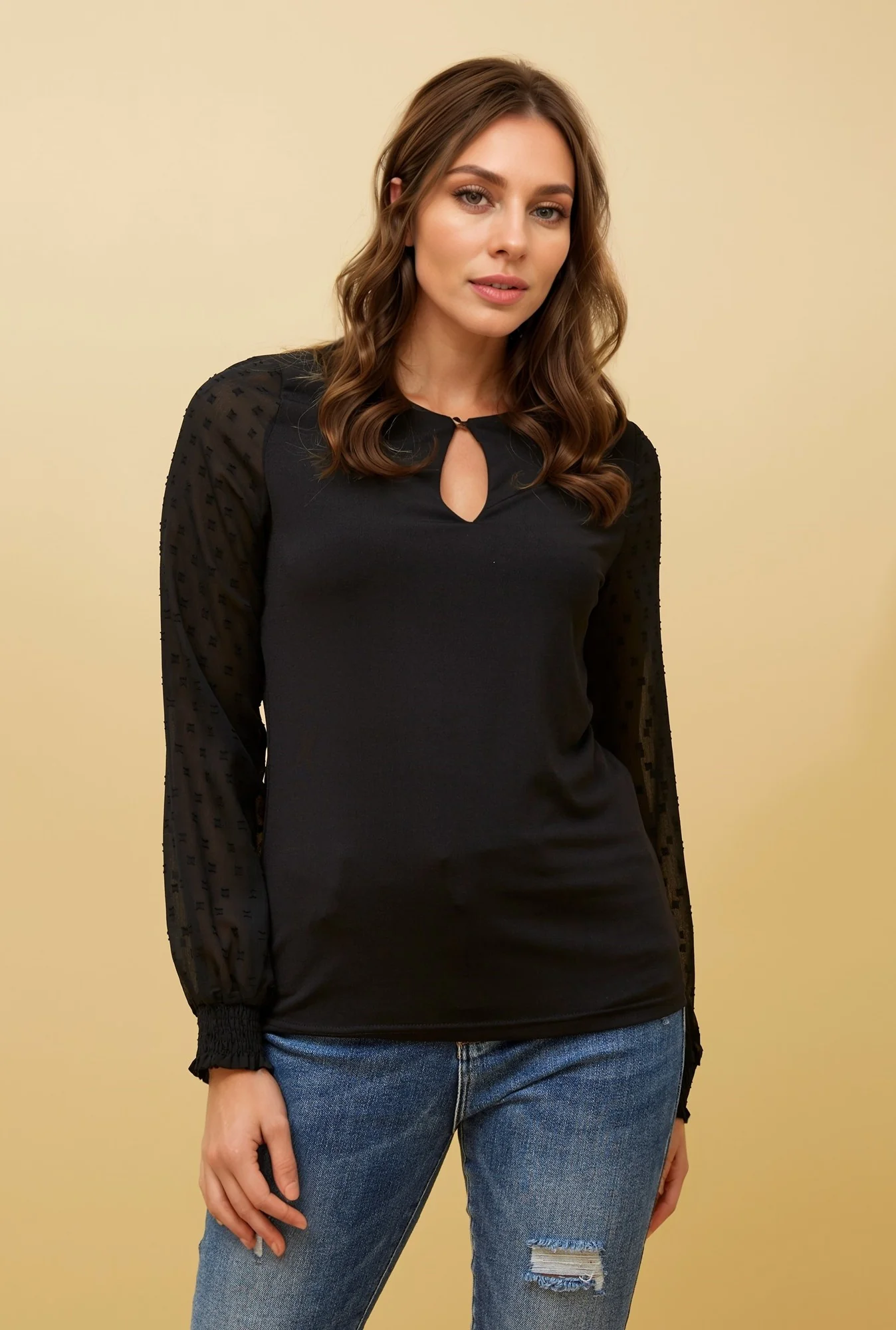 - Long sheer sleeves with shirred cuffs