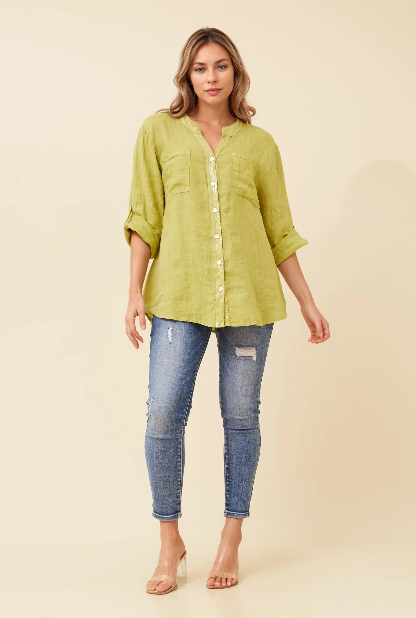Be comfortable and stylish with the Roseanne shirt. Made from breathable linen and featuring sequin detailing, this shirt offers a perfect blend of casual comfort and dressy detailling. Versatile to style, pair with jeans or shorts and complete your look with sneakers or diamante sandals.