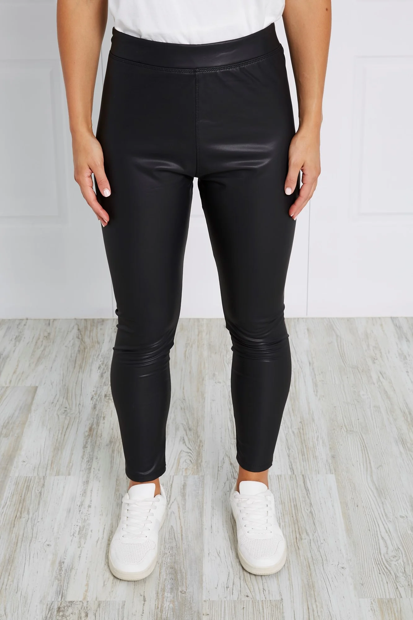 These leather look pants are a must have in any wardrobe. A soft and super stretchy fabrication, these legging style pants feature an elastic waistband, regular rise and an ankle length narrow leg. Style with your favorite knits and heels for a chic winter look.
